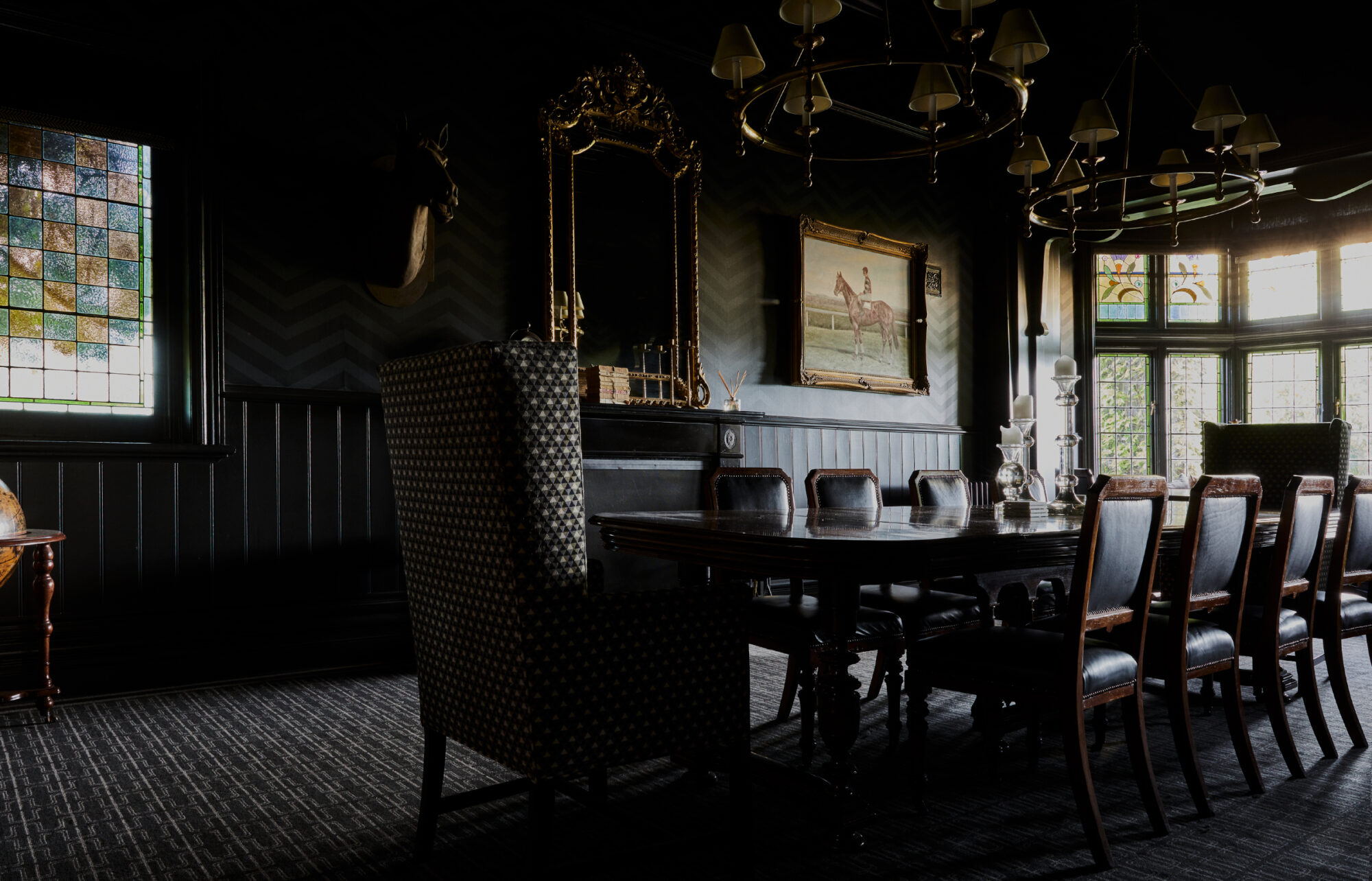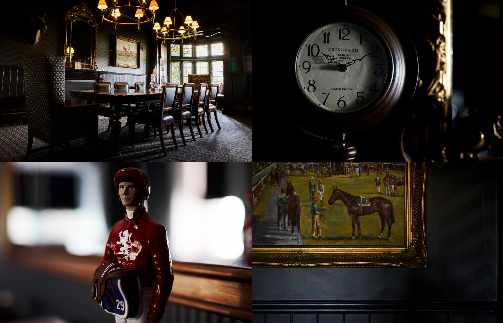 Equine elements prevail in quirky touches such as jockey paintings, horse statues and accessories, surrounded by a sophisticated blend of rustic elements and glamorous pieces.